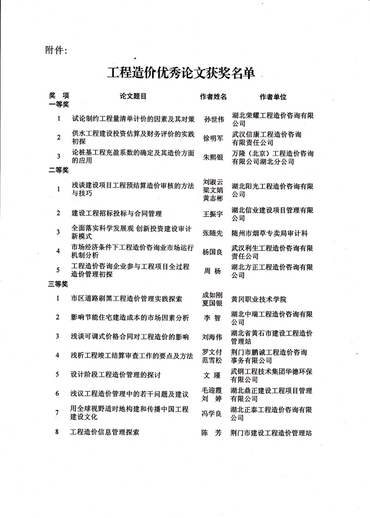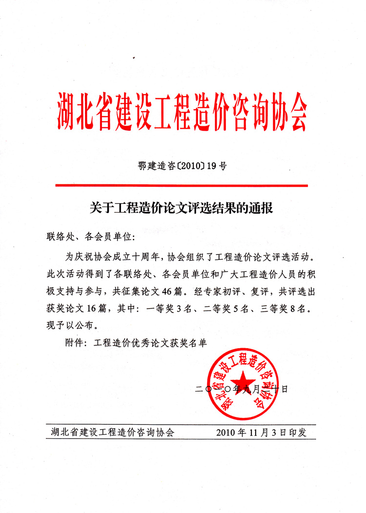 熱烈祝賀我公司在湖北省建設(shè)工程造價(jià)咨詢協(xié)會十周年之際舉辦的“工程造價(jià)論文評選活動”中獲得三等獎。