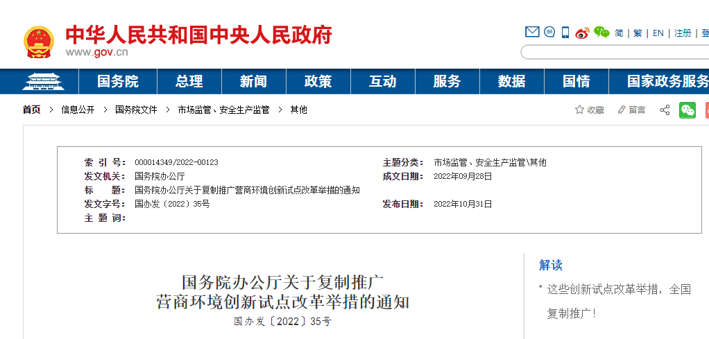 近日,國務院辦公廳發布關于復制推廣營商環境創新試點改革舉措的通知。一是進一步破除區域分割和地方保護等不合理限制,“清除招投標和政府采購領域對外地企業設置的隱性門檻和壁壘”,二是健全更加開放透明、規范高效的市場主體準入和退出機制,三是持續提升投資和建設便利度,“推進社會投資項目‘用地清單制’改革”、“分階段整合相關測繪測量事項”、“推行水電氣暖等市政接入工程涉及的行政審批在線并聯辦理”、“開展聯合驗收‘一口受理’”、“進一步優化工程建設項目聯合驗收方式”、“簡化實行聯合驗收的工程建設項目竣工驗收備案手續”、“對已滿足使用功能的單位工程開展單獨竣工驗收”等。四是更好支持市場主體創新發展,五是持續提升跨境貿易便利化水平,六是維護公平競爭秩序,七是進一步加強和創新監管,八是依法保護各類市場主體產權和合法權益,九是優化經常性涉企服務。