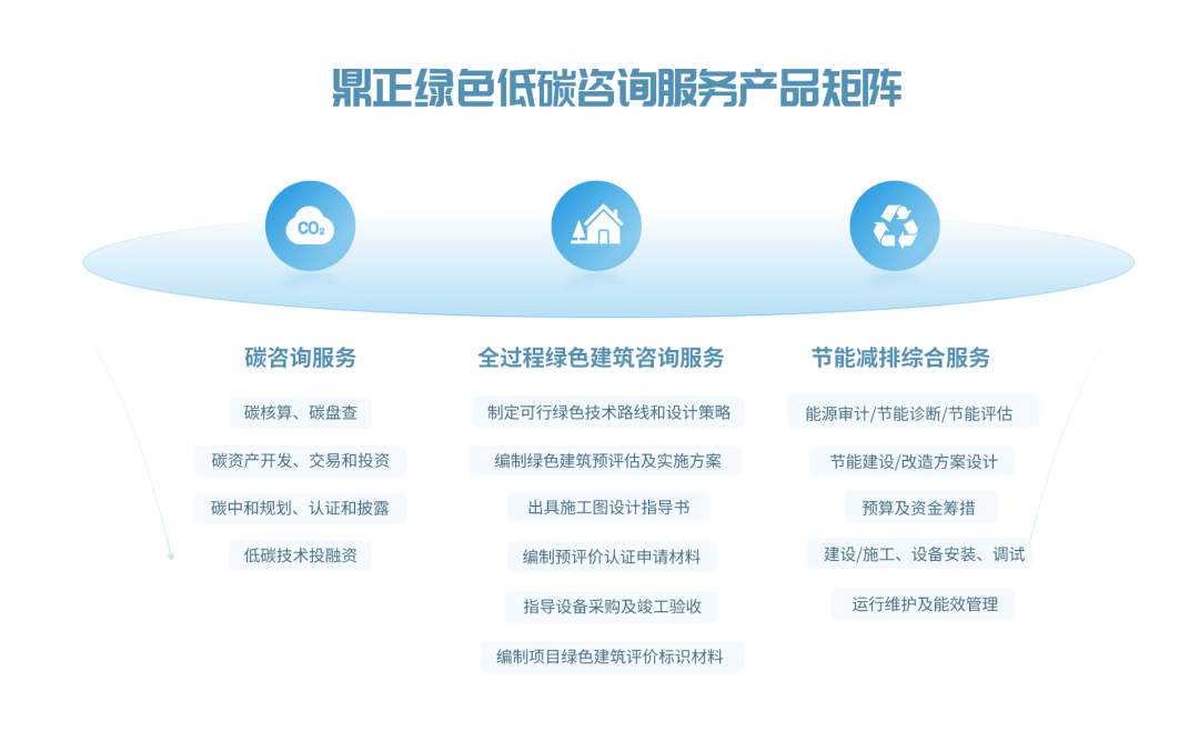 鼎故革新,正己守道。作為一家以創(chuàng)新驅(qū)動變革的工程咨詢企業(yè),我們密切關(guān)注國家前沿動態(tài),緊跟國家政策,不斷優(yōu)化產(chǎn)品結(jié)構(gòu)和服務模式。在“雙碳”目標下,自2020起即針對工程領(lǐng)域的降碳、減排展開探索,協(xié)助政府統(tǒng)籌區(qū)域能源消耗,為碳指標交易及資產(chǎn)管理、綠色金融、政策法規(guī)等方面的規(guī)劃作出指導,這為孵化綠色低碳咨詢產(chǎn)品矩陣打下堅實的基礎(chǔ)。