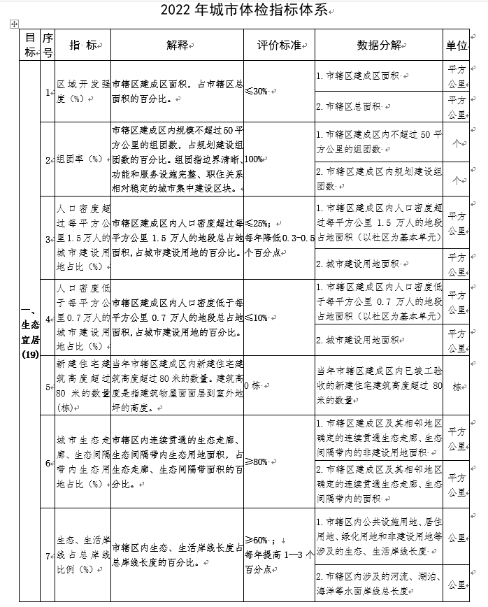 從生態宜居、健康舒適、安全韌性、交通便捷、風貌特色、整潔有序、多元包容、創新活力等8方面建立城市體檢指標體系(見附件2)。樣本城市可以結合新冠肺炎疫情防控、自建房安全專項整治、老舊管網改造和地下綜合管廊建設等工作需要,適當增加城市體檢內容。