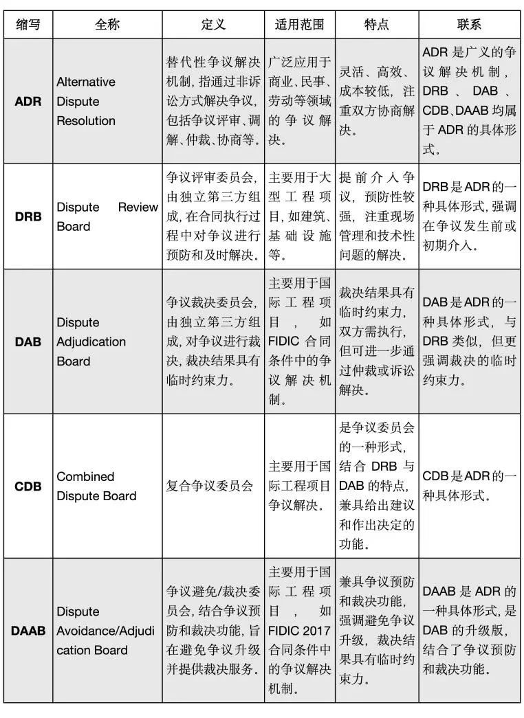 《替代性爭議解決機制(ADR)中爭議評審/裁決機制(DRB/DAB)的由來及演進》一文已經詳細介紹了ADR(Alternative Dispute Resolution)替代性爭議解決機制的概念及起源,以及在這種爭議解決方式下DRB/DAB(Dispute Review Board/Adjudication Board)爭議評審/裁決機制的演進。筆者將與之相近的幾個概念也做一對比:
