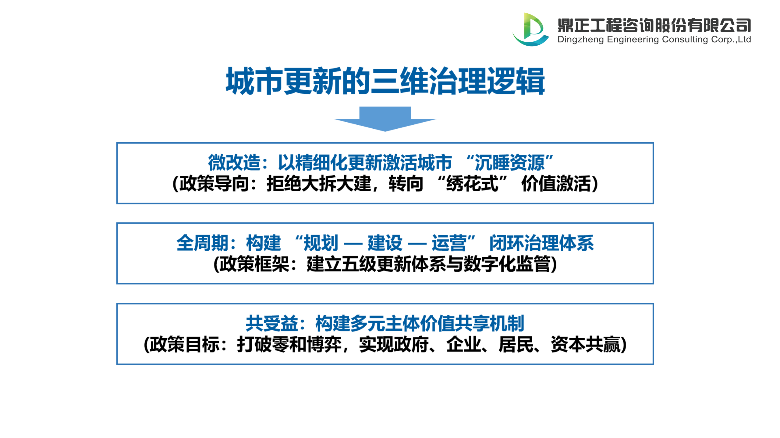 (三)共受益:價值共享機制  《意見》強調“共建共治共享”,通過角色轉型、利益分配創新與溝通機制,讓各參與方成為價值創造的主角。“共受益”旨在構建政府、企業、居民、資本多元主體共贏機制,通過角色分工、關鍵機制創新,破解訴求沖突,實現協同增效,讓城市更新成果惠及全體人民,推動從“利益博弈”到“價值共創”的轉變。