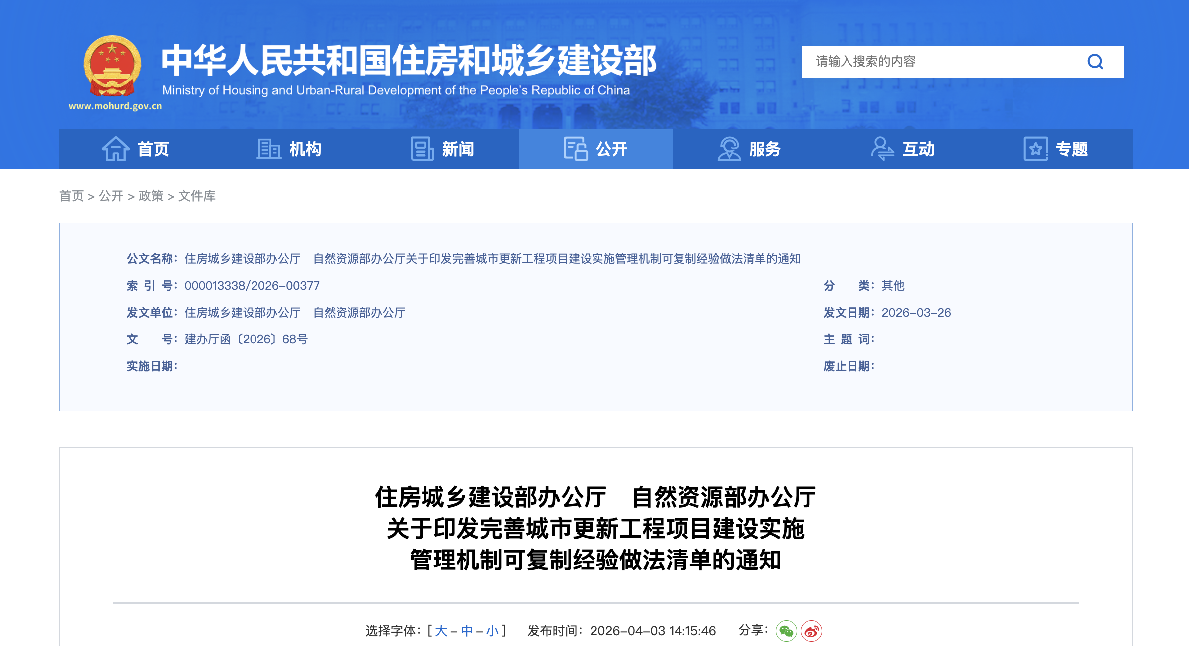 為貫徹落實黨中央、國務院關于推動城市高質量發展、持續推進城市更新行動的決策部署,各地不斷完善適應城市更新的工程建設實施管理制度機制,在加強城市更新項目前期策劃、完善城市更新政策標準規范、分類優化城市更新項目審批流程、拓展城市更新“高效辦成一件事”應用場景等方面取得積極成效。住房城鄉建設部、自然資源部梳理總結各地經驗做法,形成《完善城市更新工程項目建設實施管理機制可復制經驗做法清單》,現印發給你們,請結合實際學習借鑒。